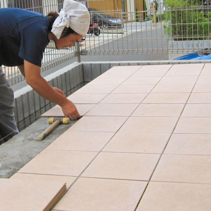 曲線部分の仕上げには向きませんが、直線部分ならスッキリと重厚に仕上がります。外装床用タイルは滑り止めが効いて安心です。