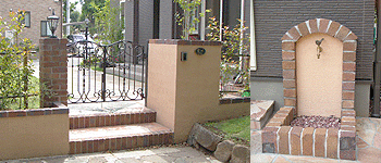 レンガと化粧左官、鋳物の門扉で重厚に仕上げました。