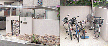 門袖の裏側に広くて屋根の付いた駐輪場を設けています。