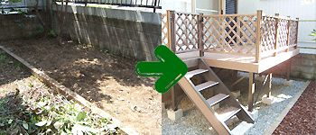 ウッドデッキは木樹脂タイプで、使い勝手を考え高床式(長尺束)タイプを設置しました。