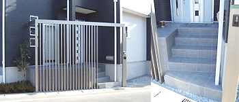 アーチ状の高いフェンスで玄関ポーチと道路との高低差をやわらげ、かつシンプルモダン雰囲気の建物に合う外構を考えました。